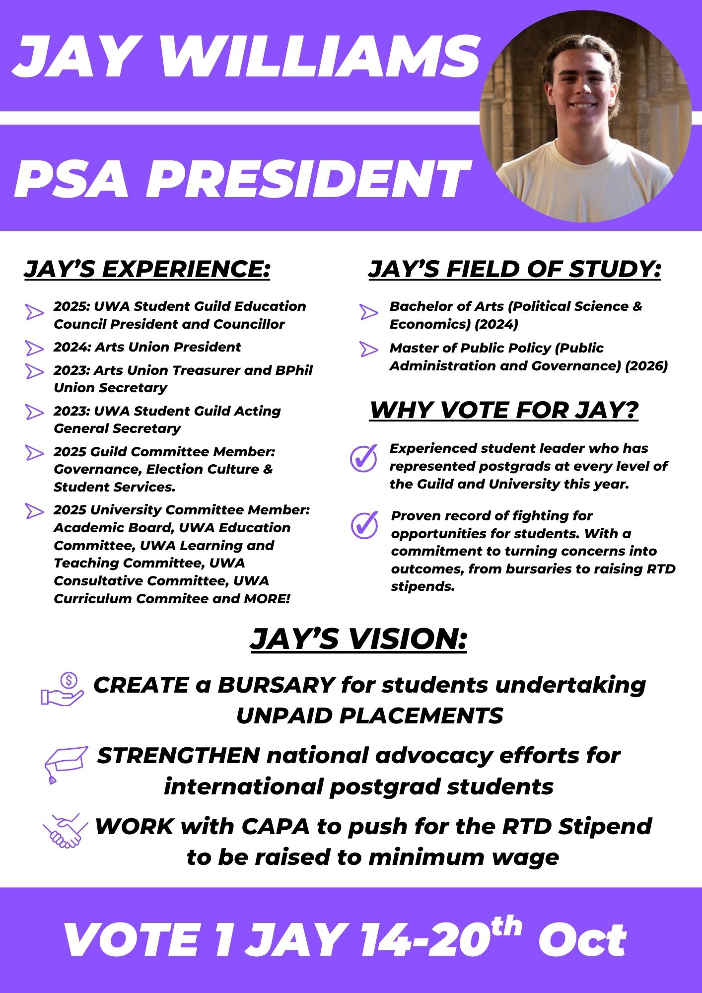 I am running because I care deeply about making postgraduate study at UWA fairer, more inclusive, and better overall. I bring a proven record of advocacy, a strong understanding of governance, and a commitment to turning ideas into tangible results. Together, we can make UWA, and being a postgraduate student here, better. Vote 1 Jay for PSA.