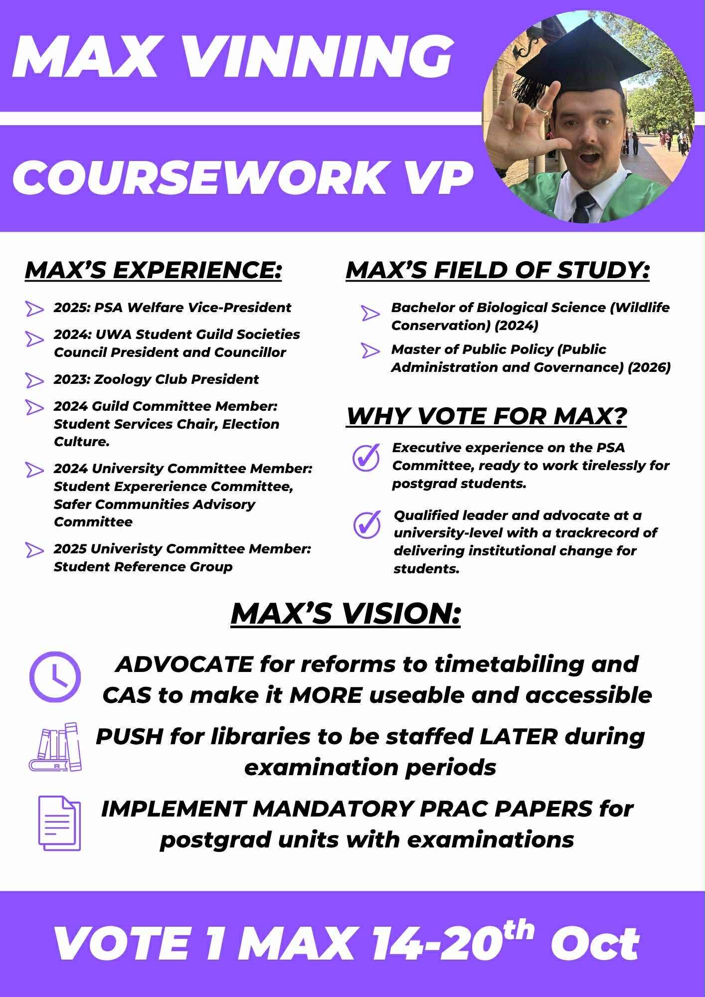 G’day my names Max Vinning and I am running to be the PSA Coursework VP in 2026. I am currently studying a Masters in Public Policy, after having completed my Bachelor of Biological Science majoring in Wildlife Conservation last year. I am also currently the Welfare Vice President on the PSA this year, after having previously served as the President of the Societies Council in 2024. I have a strong record of student leadership being a former club president in 2023 and serving on numerous University Committees in 2024 and 2025. Throughout my experience on University Committees, I have been able to deliver institutional change for students. On the Student Experience Committee, I was able to push the University to deliver free academic transcripts to students at the end of their degrees. On the Safer Communities Advisory Committee, I was able to mandate the Respectful Relationships Module for club executives.